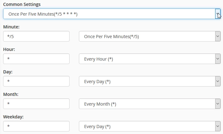 - Um die Cron-Frequenz festzulegen, können Sie ein vordefiniertes Intervall aus dem Allgemeine Einstellungen-Feld auswählen oder das Ausführungsintervall in jedem Feld manuell festlegen.