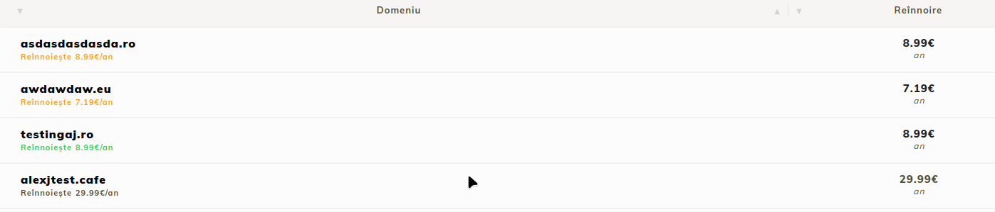 - Ihre bei Hostico registrierten Domains werden angezeigt. Sie können den Namen, den Status, die verbleibende aktive Periode und die Kosten für die Verlängerung einsehen.