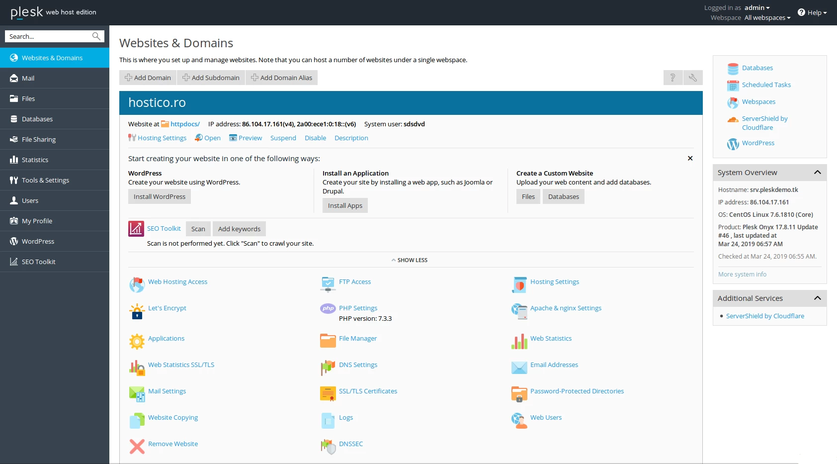 Die Plesk-Oberfläche bleibt unabhängig von der gewählten Lizenzart gleich, der Unterschied besteht lediglich in der Anzahl der Domänen, die im Panel hinzugefügt werden können.